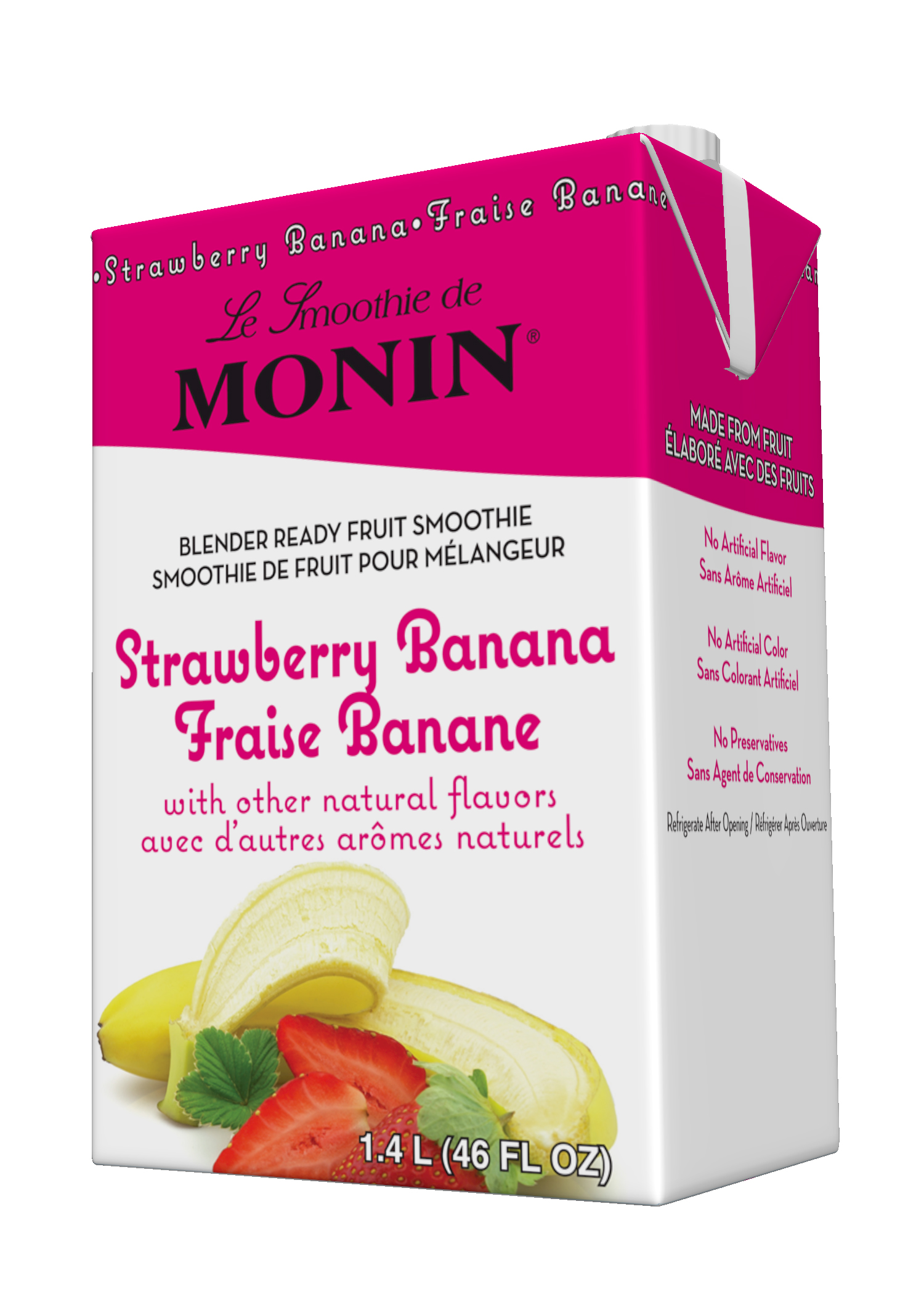 Monin Strawberry Banana Smoothie Mix makes the perfect combination of strawberry and banana easy to enjoy without constantly having to worry about real fruits going bad. Simply pour smoothie mix over ice cubes, blend, and serve. Enjoy it year round – whether it’s in season or not. Gluten Free. 190 calories per serving.